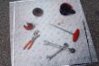 Couchtisch "Werkbank" Riffelblech mit Werkstattutensilien